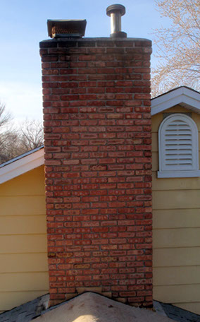 After the flueliners were replaced, the original bricks were set back in place, using colored mortar to replicate the weathered surrounding mortar. The new mortar color tames after two weeks of curing.