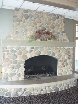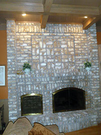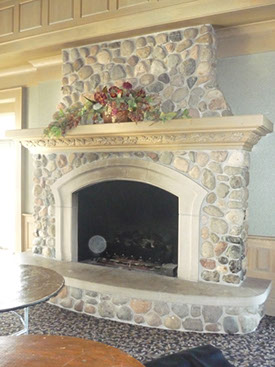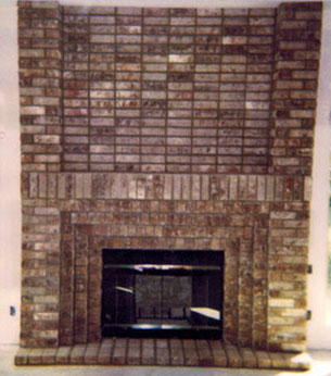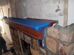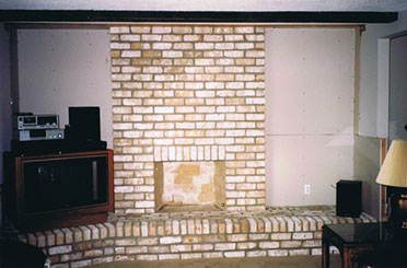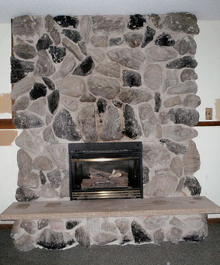 This outdated lavarock was removed and replaced with natural stone, and an elaborate Mantle-Shelf was installed.