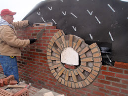 This chimney was damaged by lightning. The reusable brick were cleaned of the original mortar and reused. The new matching brick were installed on the back side of the chimney.