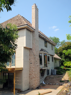 This chimney was damaged by lightning. The reusable brick were cleaned of the original mortar and reused. The new matching brick were installed on the back side of the chimney.
